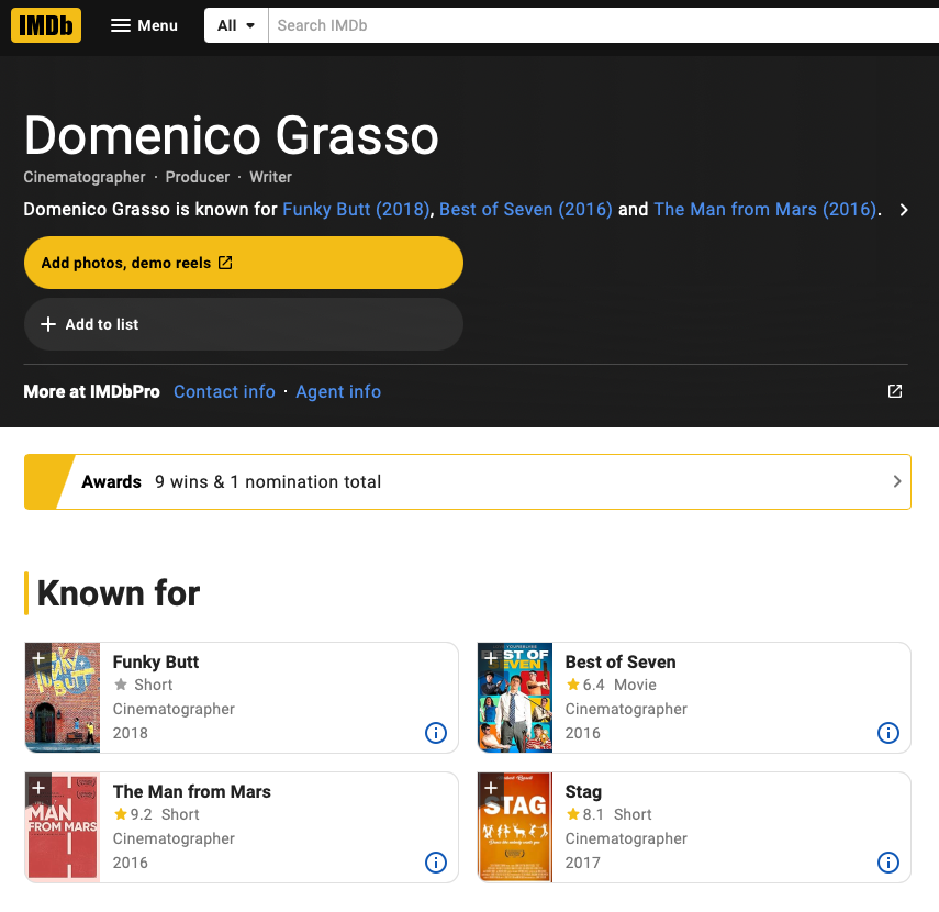 Domenico, dopo aver studiato alla UCLA di Los Angels, ha lavorato a numerose produzioni cinematografiche, ed ha anche prodotto films che sono stati distribuiti nei canali streaming americani.