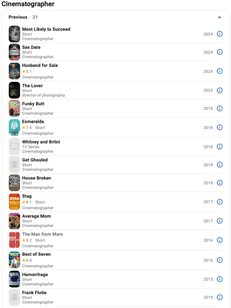 Ha lavorato e prodotto cortometraggi, films, video musicali, spot pubblicitari, documentari per l’esercito americano, e tanto altro.